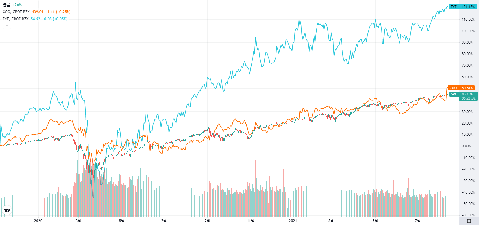 퍼센티지 상으로는 National Vision Holdings(EYE)측이 상승률이 월등히 높았습니다.